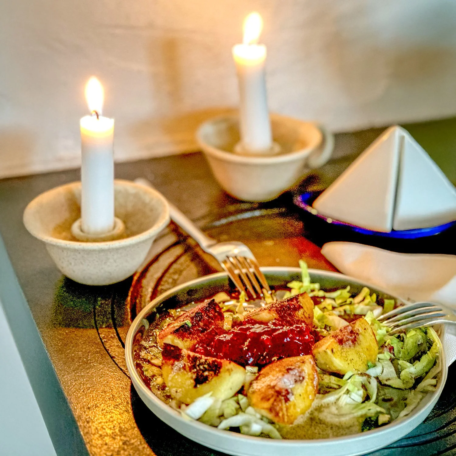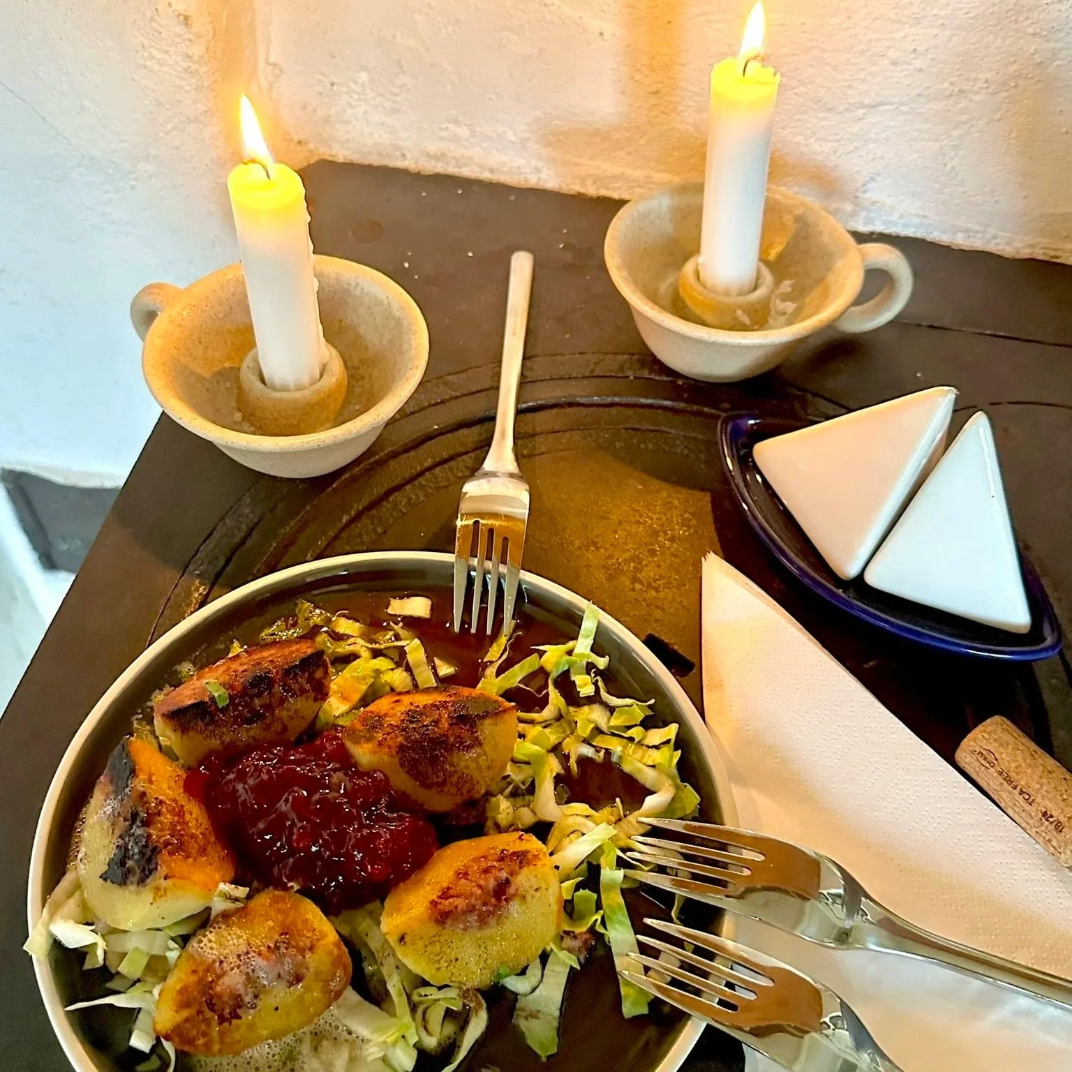 Kroppkakor är en traditionell svensk rätt gjord på potatisdeg fylld med rimmat fläsk och kryddad med lök och kryddpeppar. I denna variant delas de kokta kroppkakorna i fyra delar för att skapa små munsbitar i tapasformat. Serverade med smält smör och rårörda lingon blir de ett uppskattat inslag på buffébordet. Tapasformen gör dem lätta att äta utan bestick och passar både till vardag och fest. Ett sätt att modernisera klassisk husmanskost utan att tappa dess karaktär.