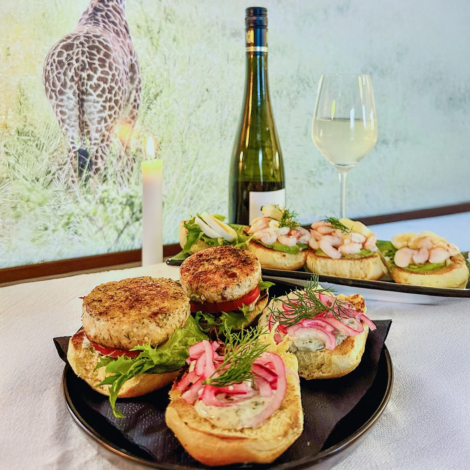 Tapas lax och räkburgare är en modern klassiker där färsk lax och räkor serveras som burgare – gärna i små briochebröd. Toppa med dill, picklad rödlök och majonnäsbaserad dressing.