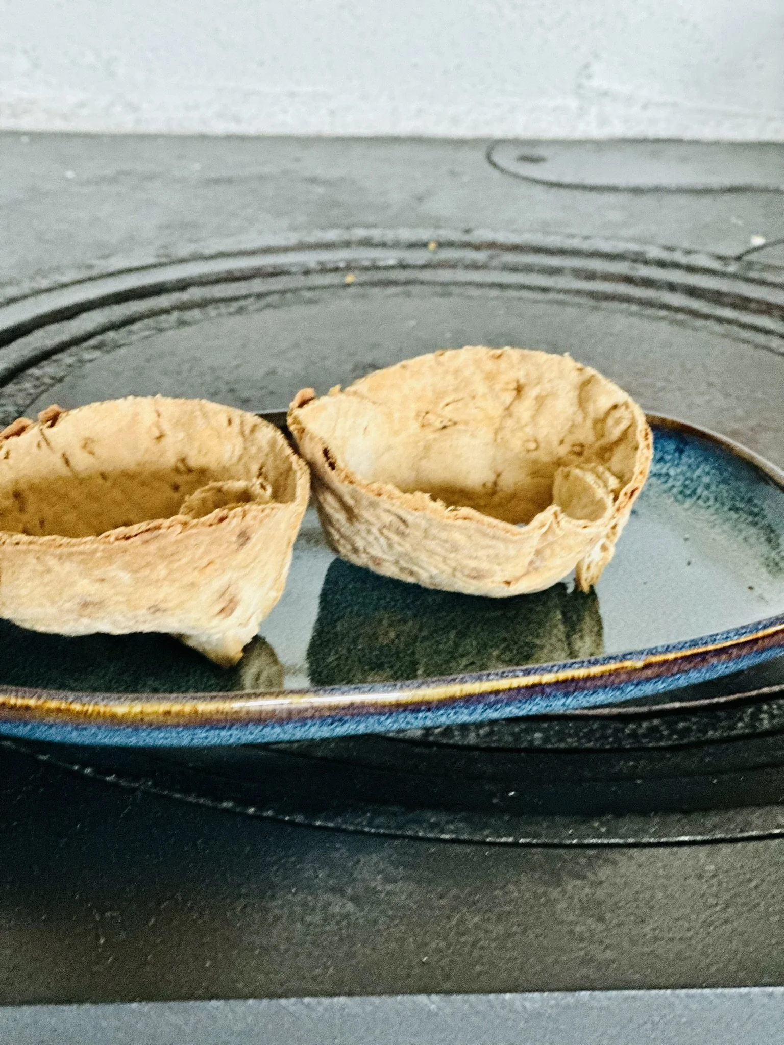 Forma tunnbrödet till små korgar. Ta hjälp av en form, så går det lättare. Skala mandelpotatisen och lägg dem i vatten. Koka upp potatisen.